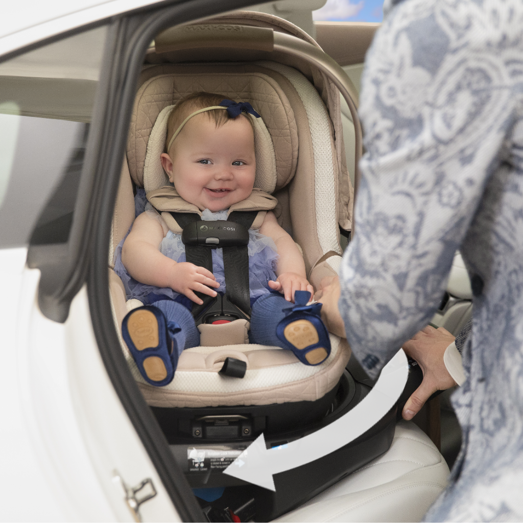 Easily get your little one in and out of the car. Our new infant car seat is designed with FlexiSpin, which lets you rotate baby toward you 180° to reduce back strain.