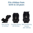 Our infant to toddler car seat has 3 modes: rear facing car seat (5–40 lbs., 19"–40"), forward facing car seat (30–65 lbs., 34.4"–49"), belt-positioning booster car seat (40–100 lbs., 43.4"–52").