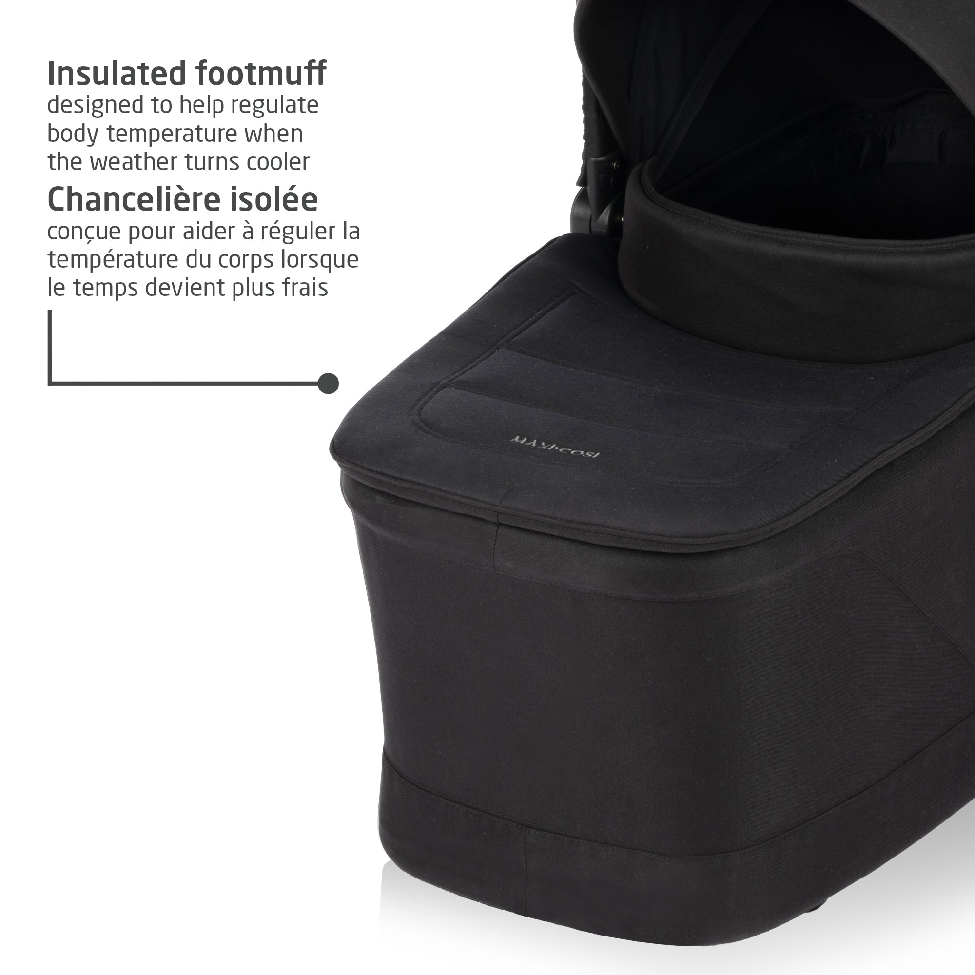 The insulated footmuff helps regulate body temperature in cooler weather. Its compact, foldable design makes storage and transport simple, and the 2-click system allows easy attachment to Maxi-Cosi Oxford or Leona stroller frames.