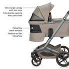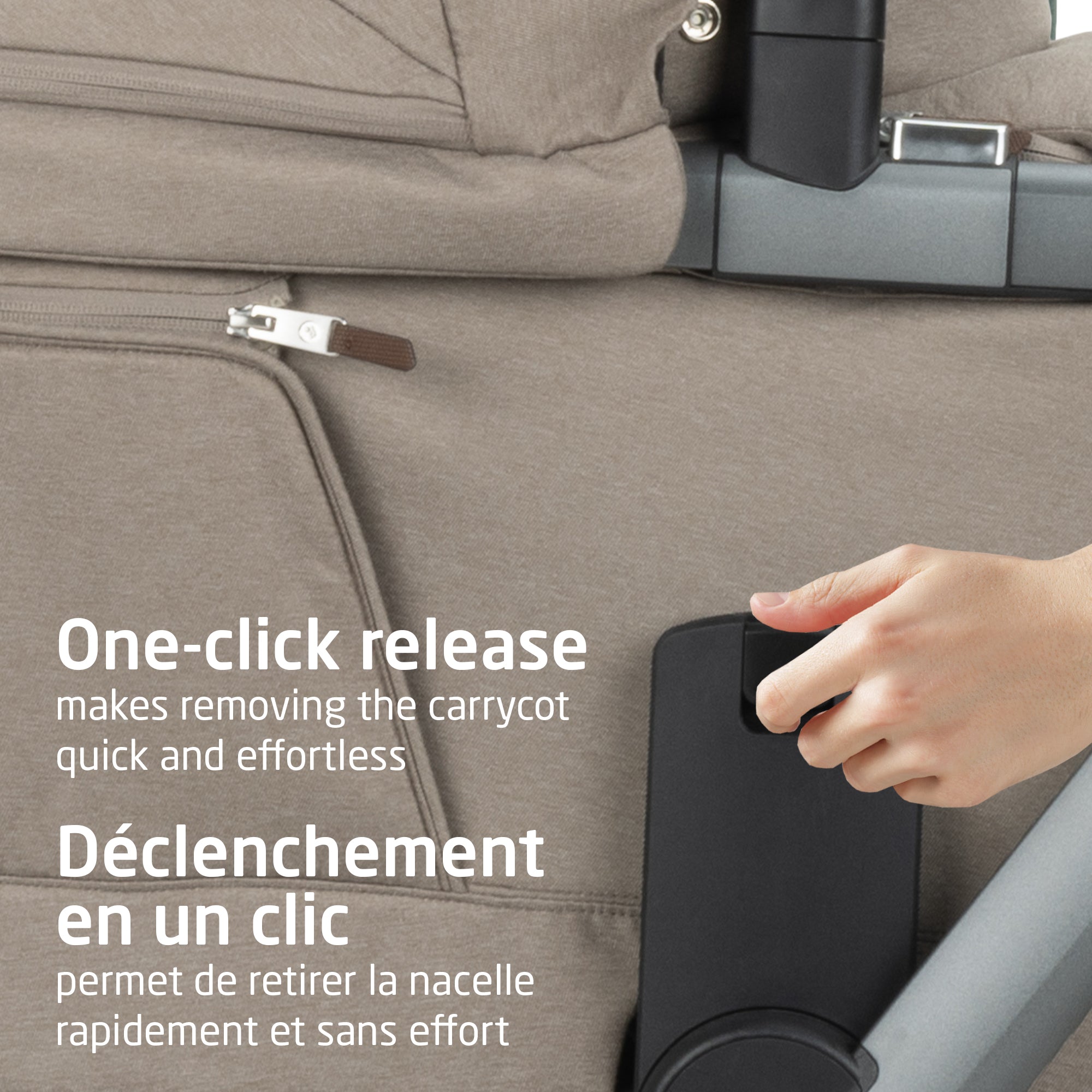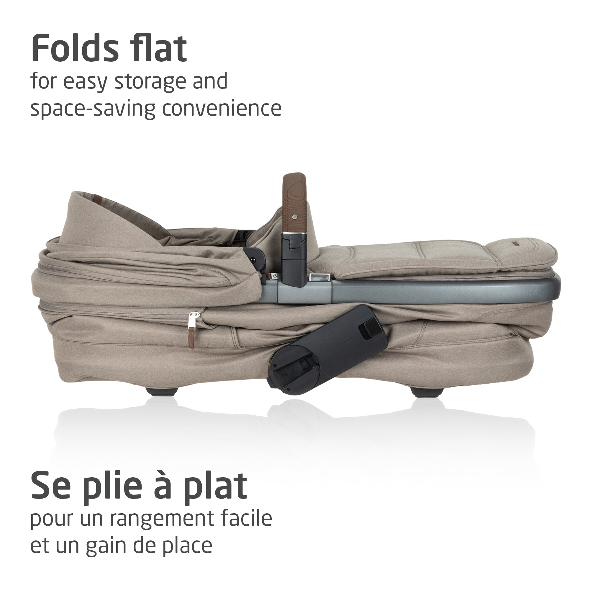 The Fame Carrycot easily clicks into place on the Fame stroller frame, along with Maxi-Cosi Mico infant car seats, for a seamless travel system.