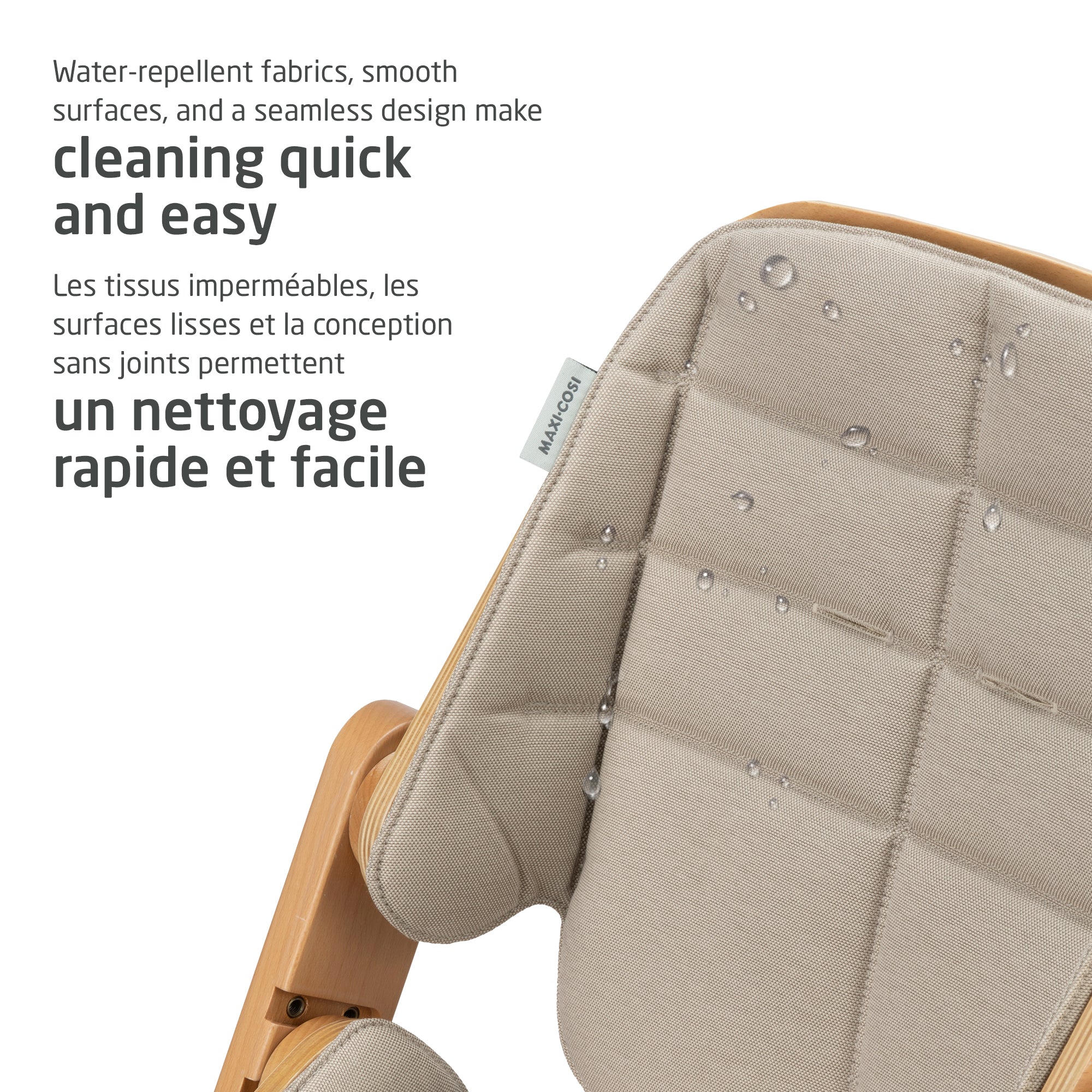 Thoughtfully designed for modern living, Nesta’s adjustable seat and footrest ensure the perfect fit for infants, toddlers, teenagers, and even adults. Its high backrest provides excellent support, while the timeless wooden design complements any space, from the kitchen table to a study desk or child’s bedroom. With its seamless construction, Nesta is easy to clean, resisting trapped crumbs and mess. Water-repellent fabrics made from premium recycled materials further simplify maintenance, ensuring the chair remains as practical as it is stylish.