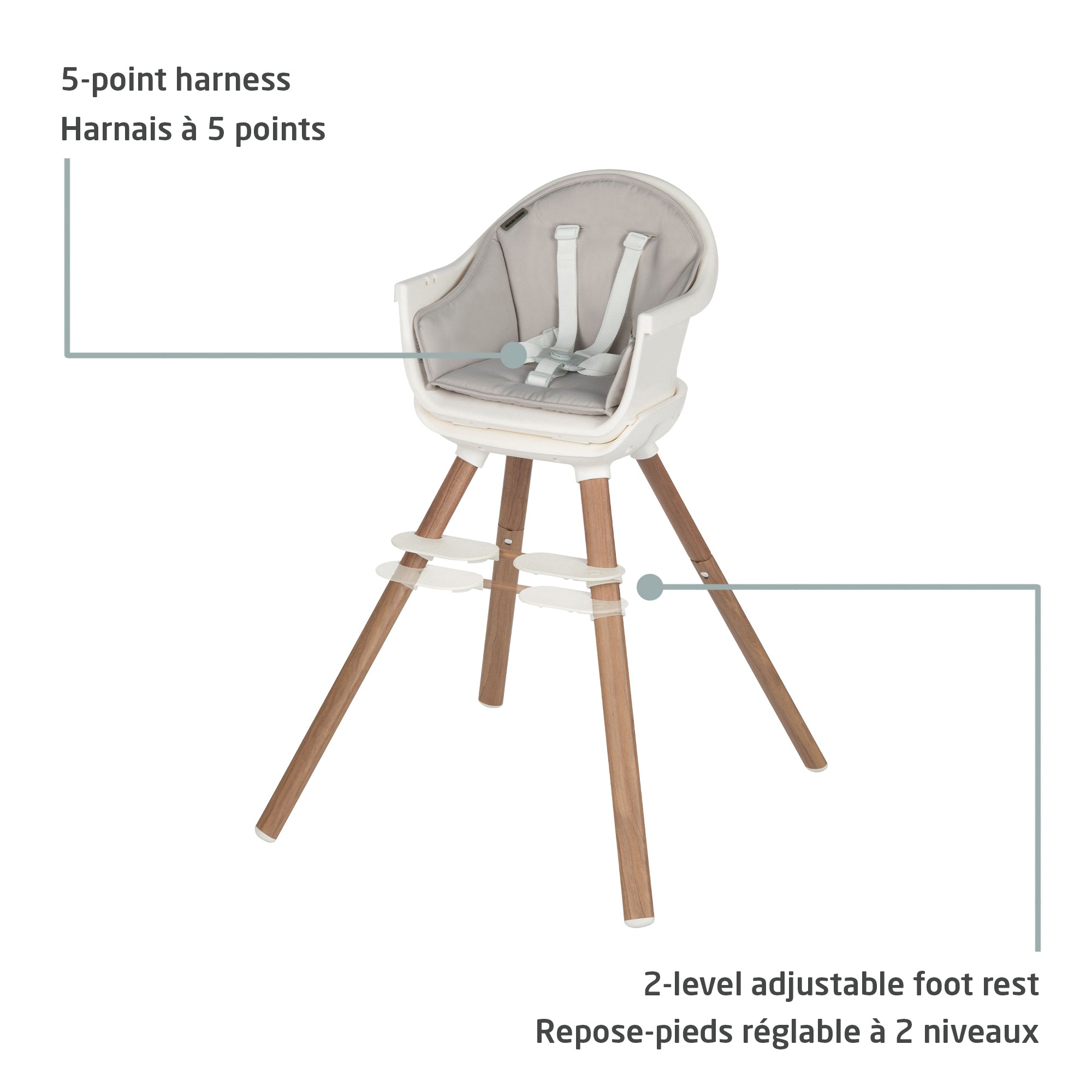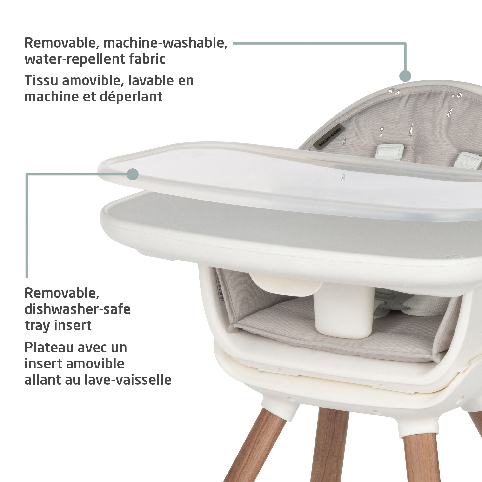 Alliant praticité et confort, l’assise comprend un coussin hydrofuge lavable à la machine pour un nettoyage rapide et facile après chaque repas. Le plateau amovible et lavable au lave-vaisselle simplifie les routines après les repas, tandis que le repose-pieds ajustable à 2 niveaux soutient la posture et le confort de votre enfant à mesure qu’il grandit.