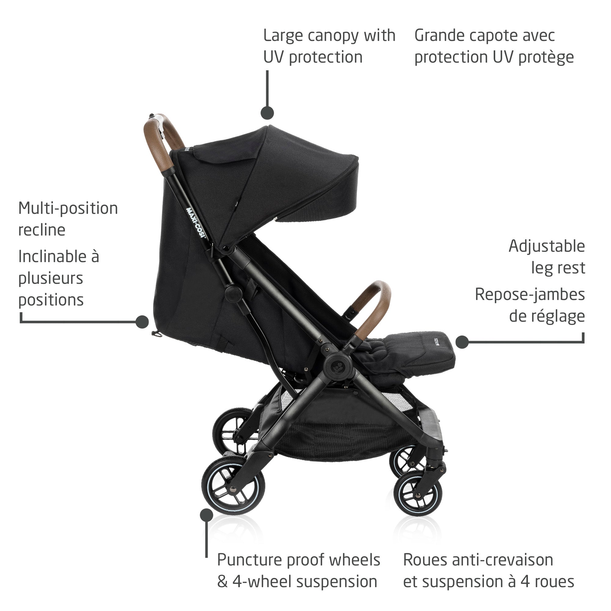 Conçues pour rouler en douceur, les roues résistantes aux crevaisons et la suspension à 4 roues absorbent les chocs et les irrégularités de la chaussée pour se promener confortablement sur tous les terrains au quotidien. Un harnais de sécurité à 5 points avec une boucle magnétique facile à utiliser permet d'attacher votre enfant de manière sécuritaire, rapidement et sans difficulté.