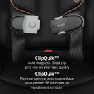 Vous apprécierez la facilité avec laquelle vous pouvez installer et retirer votre enfant du siège grâce au clip de poitrine magnétique à une main ClipQuik™. L'attache et le décrochage se font sans difficulté.