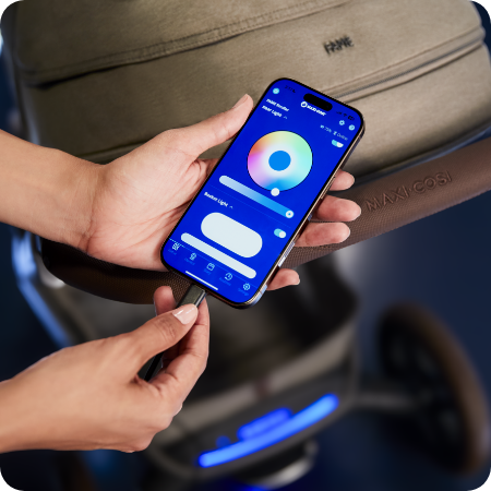 This innovative stroller is equipped with the Maxi-Cosi LumiRide system––integrated LED lights on the frame and storage basket that illuminate dimly lit pathways so you can see where you’re going, and others can see you. Use the Connected Family app to control and adjust the lights, including color and brightness. Because convenience and accessibility are important, you can charge your mobile device on the go with the easy-to-access USB-C port.