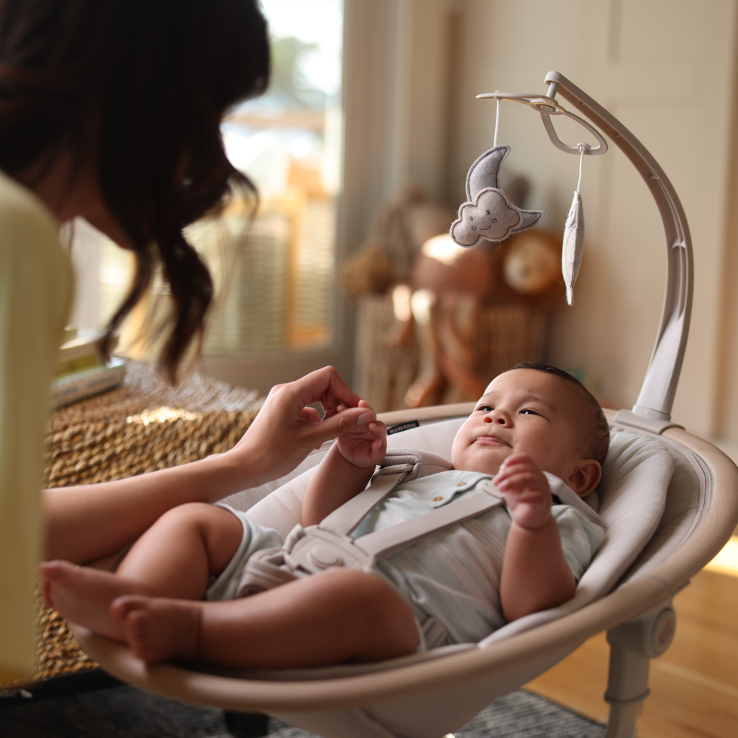 This baby swing combines innovative, lightweight design with a sophisticated, modern color palette intended to blend beautifully with your décor. Select color options feature EcoCare––our new premium, future-friendly, 100%-recycled fabric made from plastic bottles. The yarn produced is soft, comfortable, and breathable––perfect for your little one. Cassia was made to bring tranquility into a busy day by providing soothing comfort for baby plus convenience for you, and ultimately enhance your quality time at home. For babies up to 20 lbs.