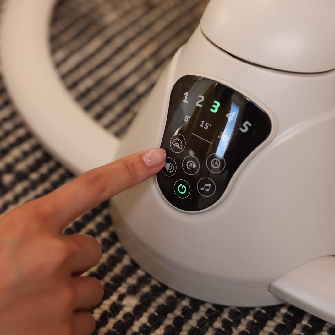 Swing smartly in style with the Cassia baby sswing, designed to give you freedom and flexibility while comforting your little one. The automatic motion detection (with on/off button) senses when your infant needs extra soothing and activates the swing. Its built-in touch screen panel allows you to select from 5 swing speeds, plus 12 melodies and nature sounds to keep baby relaxed and entertained. The 360⁰ rotation helps you both feel connected and engaged. At only about 10 lbs., the Cassia Swing is easy to transport from room to room.