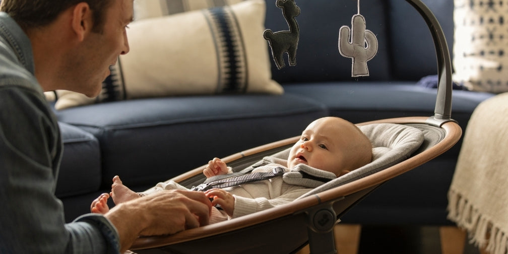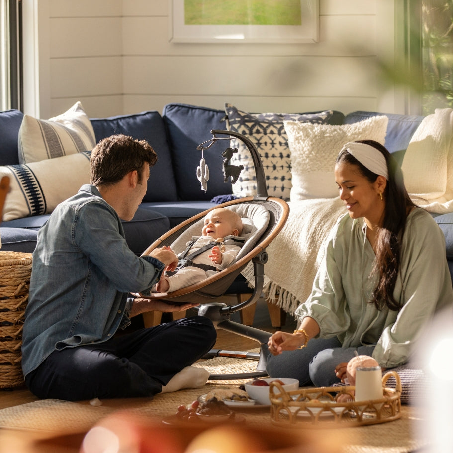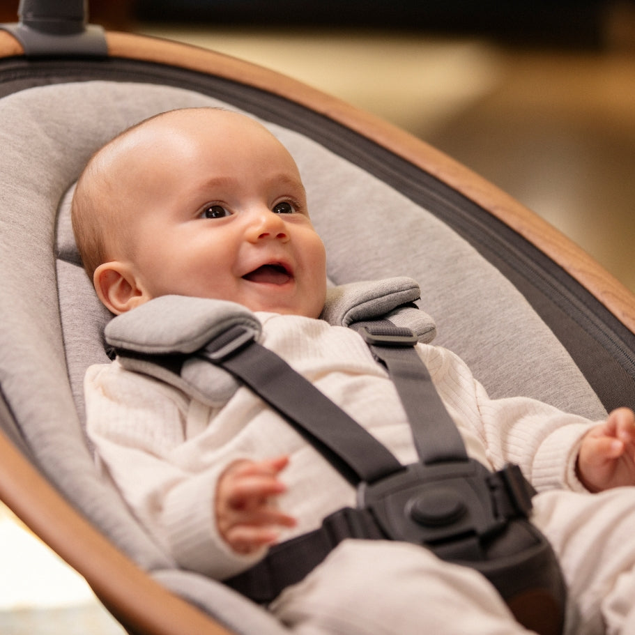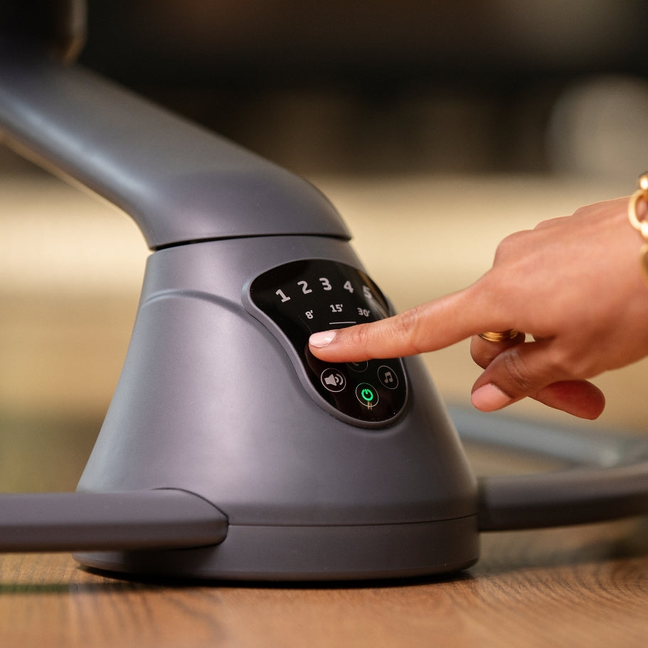 Swing smartly in style with the Cassia Swing designed to give you freedom and flexibility while comforting your little one. The optional automatic motion detector senses when your infant needs extra soothing and activates the swing. Its built-in touch screen panel allows you to select from 5 swing speeds, plus 12 melodies and nature sounds to keep baby relaxed and entertained. The 360⁰ rotation helps you both feel connected and engaged. At only about 10 lbs., the Cassia swing is easy to transport and folds compactly when you want to tuck it away.