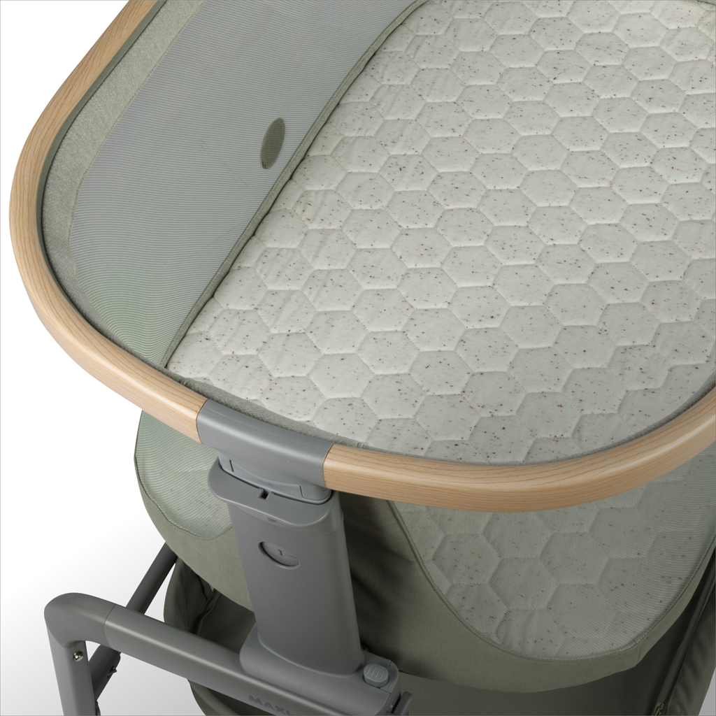 Many parents rest better knowing their infant is close when they sleep, and appreciate the convenience of keeping diaper changes nearby in the middle of the night as well. The Iora Bedside Bassinet is a dream come true featuring the ability to adjust it up and down, and move it through 3 slide positions, so you can find the right fit for your situation. Its sophisticated and modern color palette is thoughtfully designed to become a subtle addition to your décor. Select color options feature EcoCare––our new premium, future-friendly, 100%-recycled fabric made from plastic bottles. The yarn produced is soft, comfortable, and breathable––perfect for your little one. The breathable mesh sides allow airflow and help you feel connected while baby rests soundly on the comfy mattress. Stow extra pajamas and essentials in the spacious storage basket to avoid searching for those must-haves in the dark. When you travel, this bassinet is easy to take with you. Just fold it flat, put it in the travel bag, and you’re ready for sleepovers at Grandma’s or a hotel getaway. With Iora, at the end of the day, it’s all about comfort.