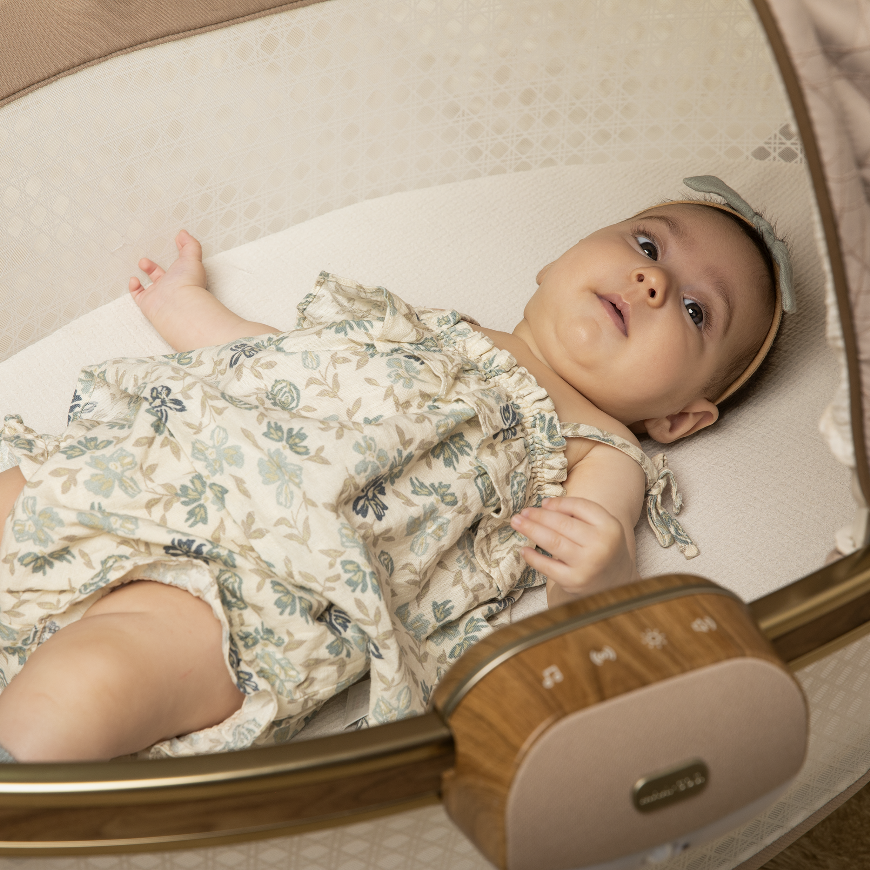 The baby monitor can be attached on either side of the Sibia Bassinet or placed on an adjacent tabletop. A dimmable nightlight with an automatic motion sensor lets you check on your baby without having to disturb them by turning on an overhead light. With a built-in soother that plays 5 different sounds, including lullabies and white noise, and Bluetooth® for music and media streaming, it’s more than just a baby monitor.