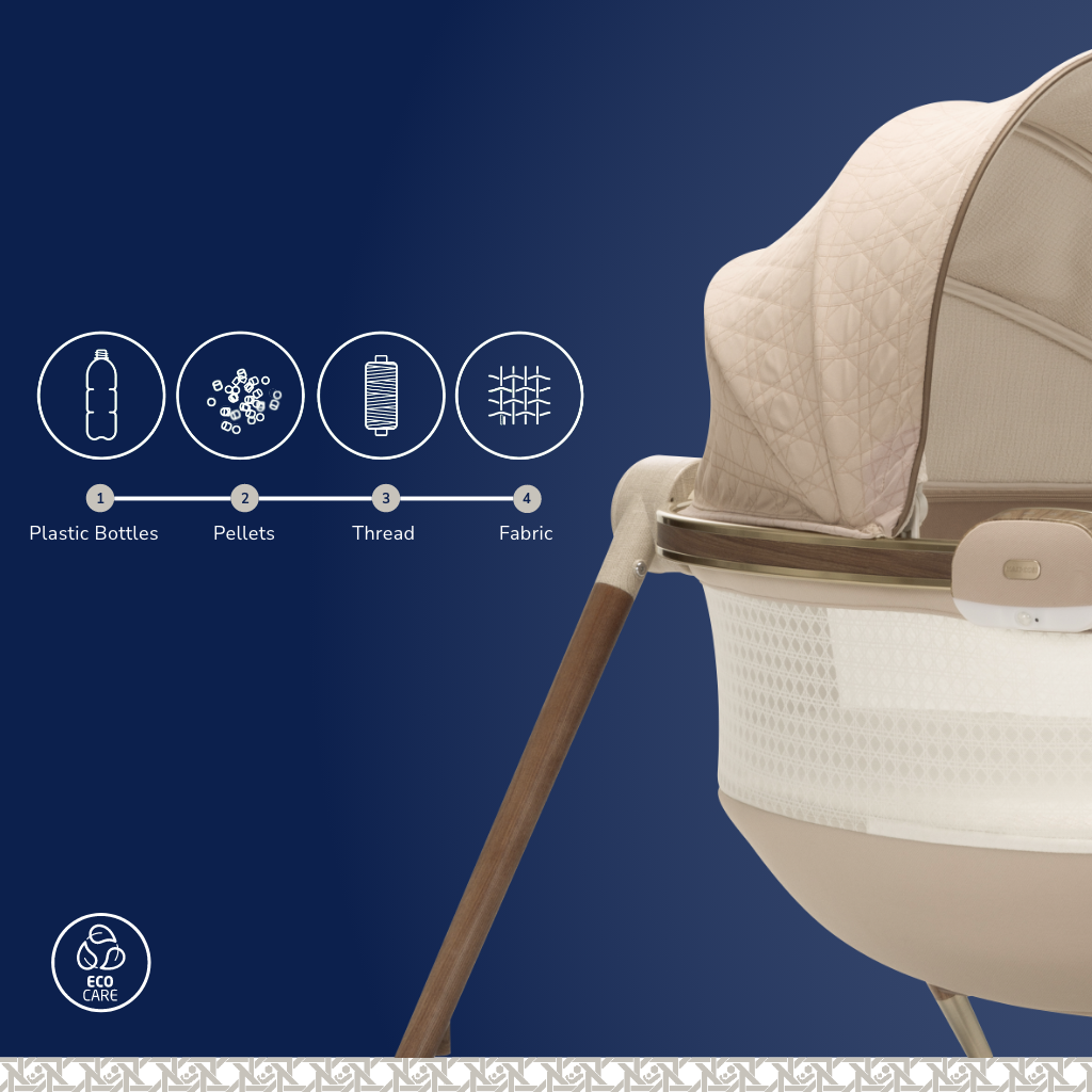 Suitable for babies up to 20 lbs., the Sibia Bassinet’s cozy mattress pad with a removable, machine-washable cover allows you to create the ideal space for your child. The removable, adjustable half-canopy provides an extra layer of privacy whenever the occasion calls for it. Anti-scratch leg caps keep both the legs and your home blemish-free, and the legs themselves fold together for easier storage. This product is designed with a firm, flat sleeping surface that meets the Consumer Product Safety Commission’s recommendations for safe sleep. Key to its design is the use of EcoCare, our new premium, future-friendly, 100%-recycled fabric made from plastic bottles. The yarn produced is soft, comfortable, and breathable––perfect for your little one.