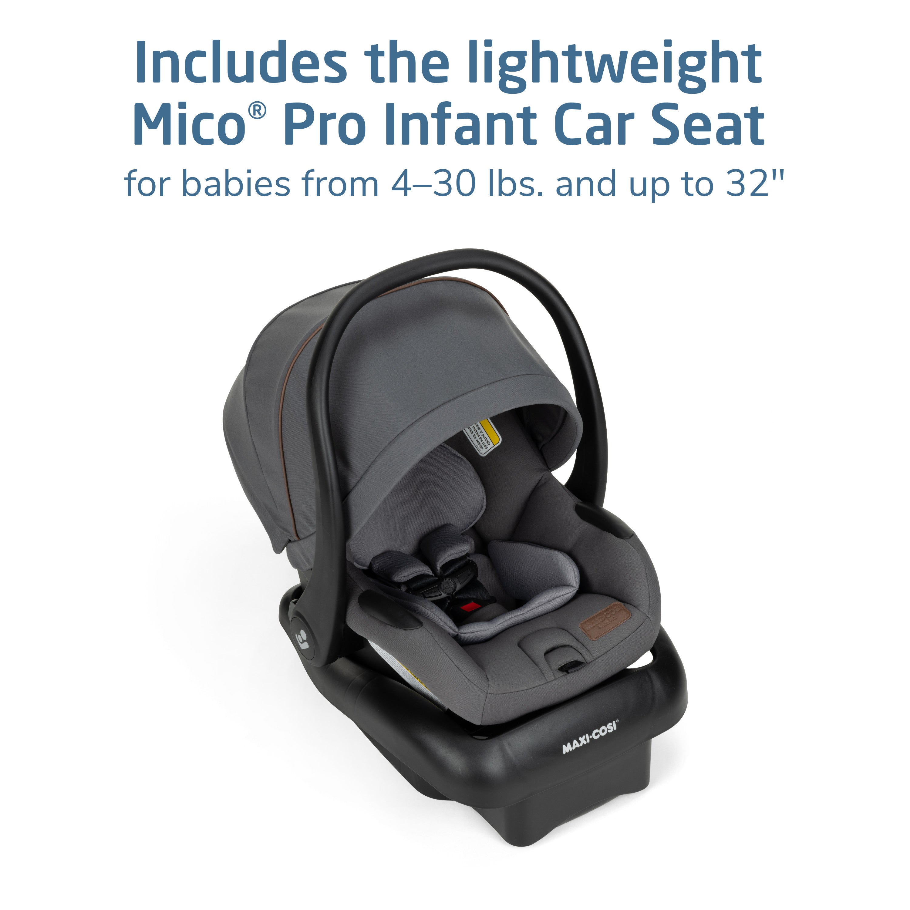 Included is the Mico® Pro Infant Car Seat, a lightweight, secure infant carrier car seat designed to cradle your newborn in plush comfort. This car seat features removable, ultra-soft infant inserts, and premium fabrics, such as PureCosi™––made without fire retardant treatment and EcoCare––100%-recycled fabric made from plastic bottles. The Mico Pro rear-facing car seat accommodates babies from 4–30 lbs. and up to 32".
