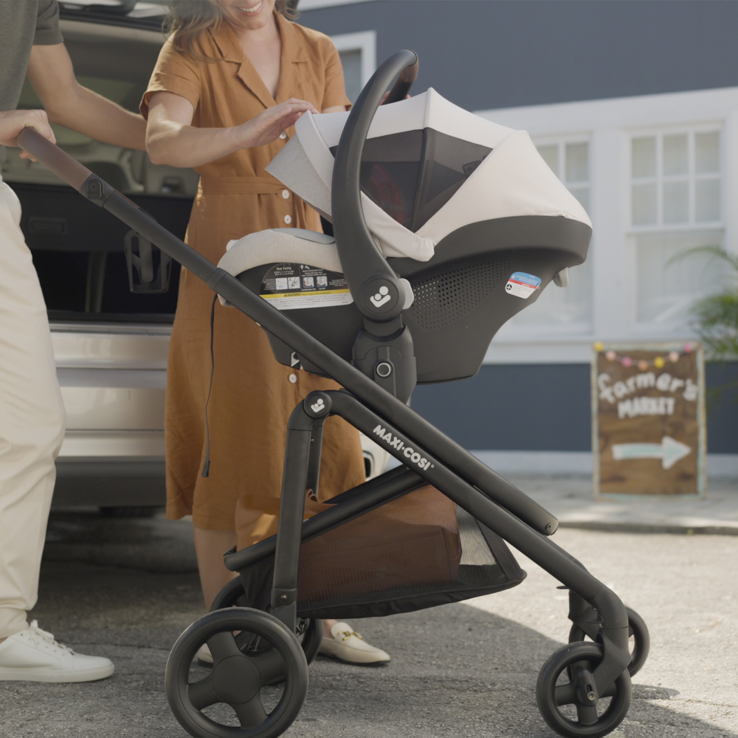The Mico™ Luxe+ Infant Car Seat (included) provides premium comfort with plush PureCosi™ fabrics and padding made without wool or added fire retardant treatment. Plus, the shell is designed with ClimaFlow™ technology for added ventilation to keep babies cooler, and the ventilated canopy allows increased airflow. The vegan-leather trim on the contoured handle adds style and provides a more comfortable carrying experience.