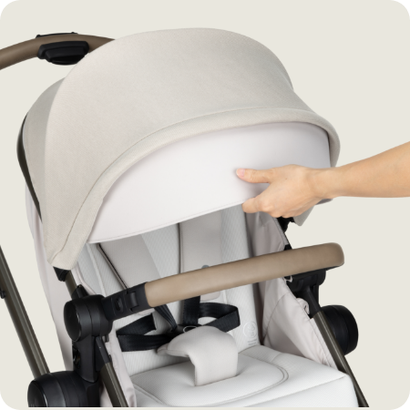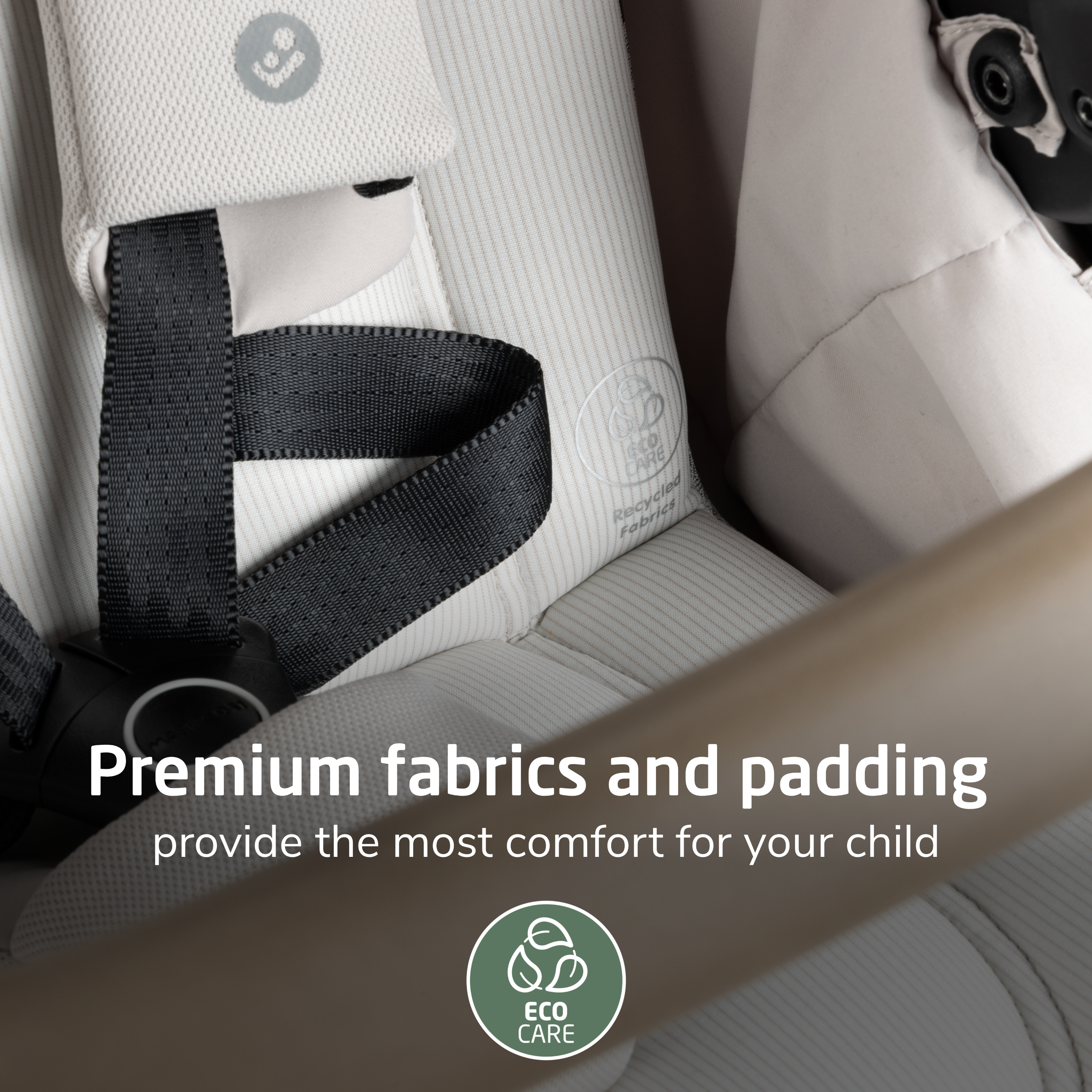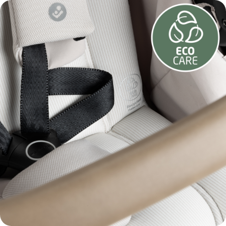 Both the stroller and infant car seat have vegan-leather accents for added style and comfort and are designed with EcoCare fabric, our premium, future-friendly, 100%-recycled fabric made from plastic bottles. The yarn produced is soft, comfortable, and breathable.